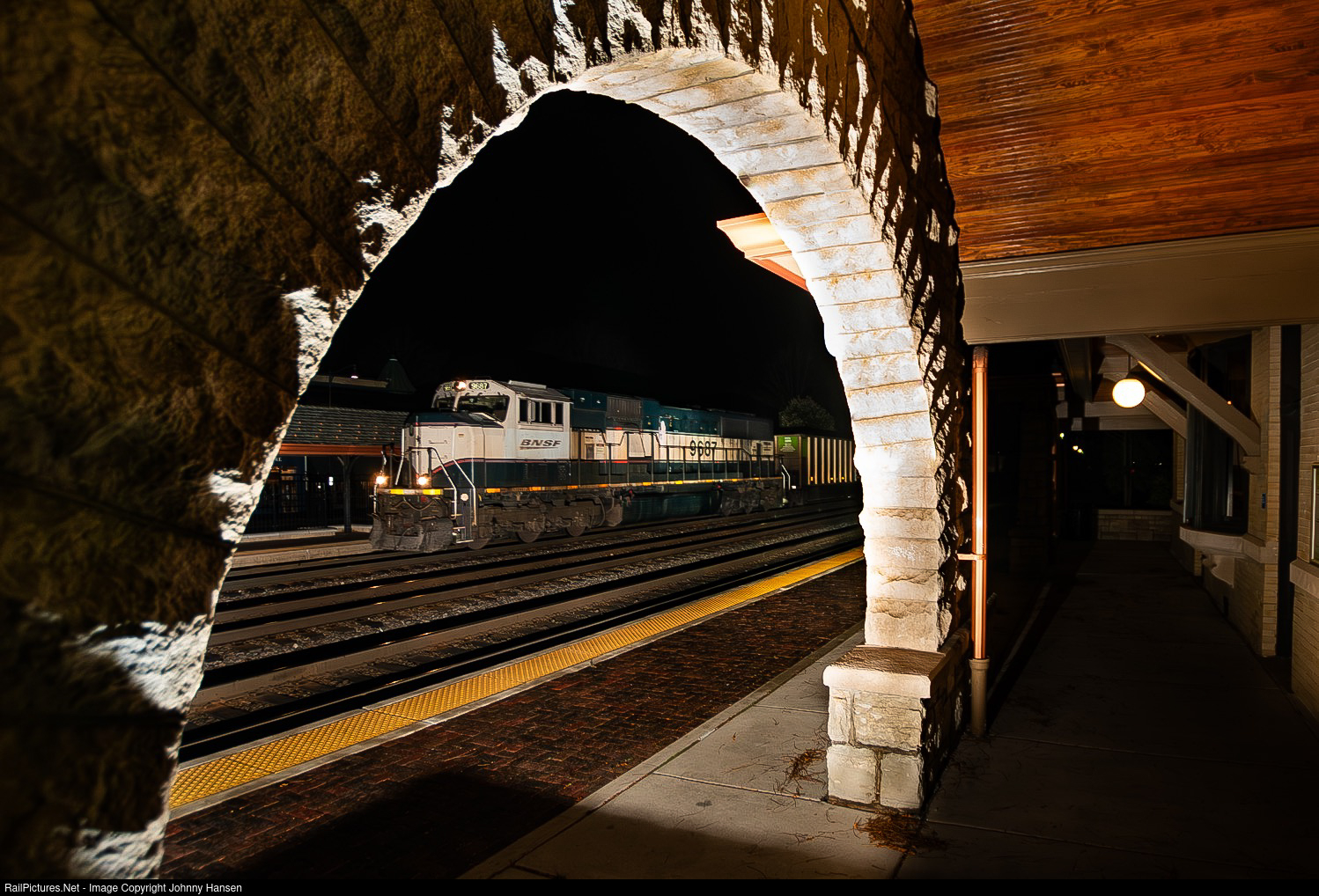 | It’s just after 3:45am as C-CXCNAM heads west past the old CB&Q depot at Stone Avenue with a former Burlington Northern SD70MAC, 9687 leading solo with an empty coal train. |