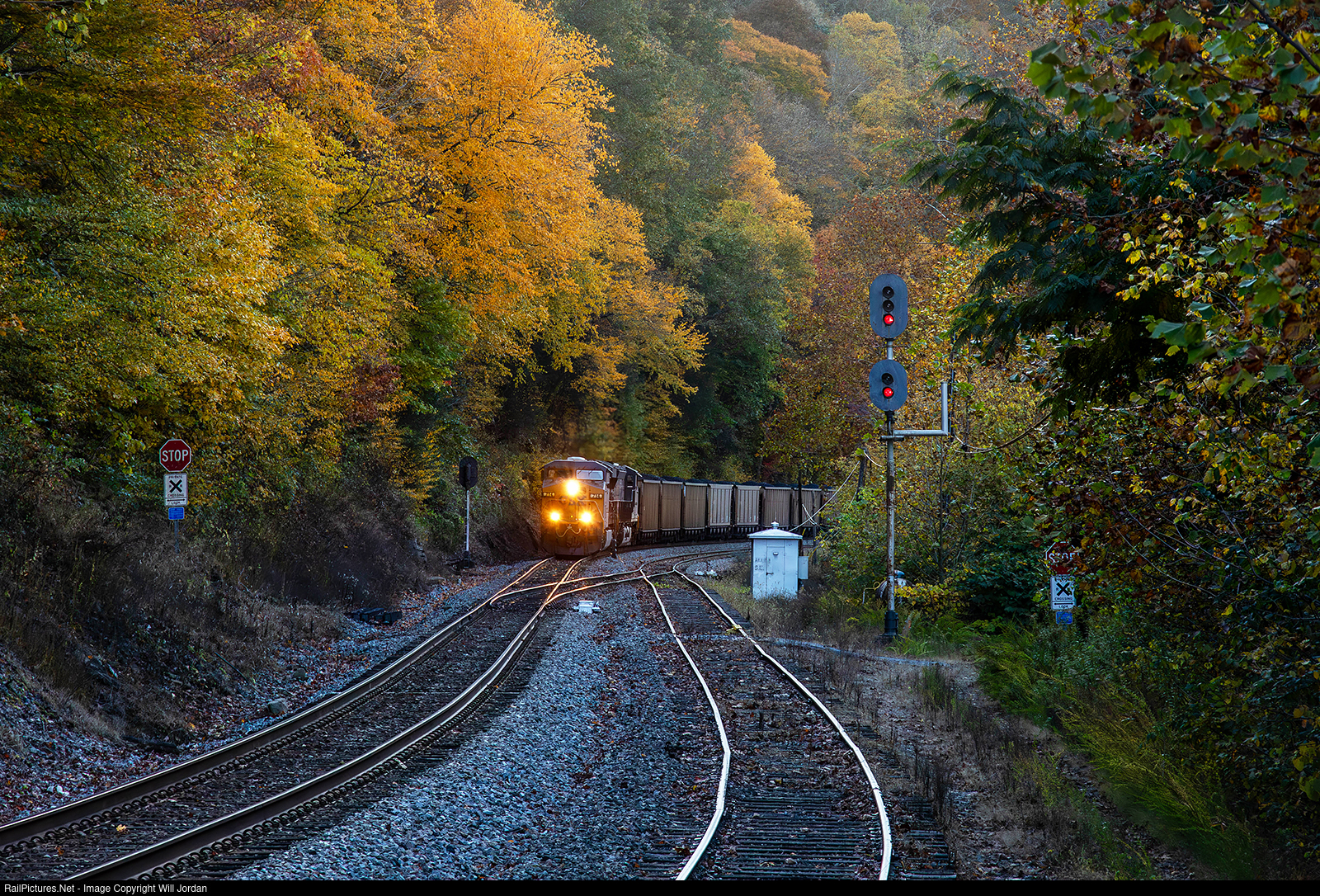 A coal drag for the Carolinas snakes beneath a mountain backdrop turned ablaze by fall colors. Clinchfield signals still guard the control point here at Allen.