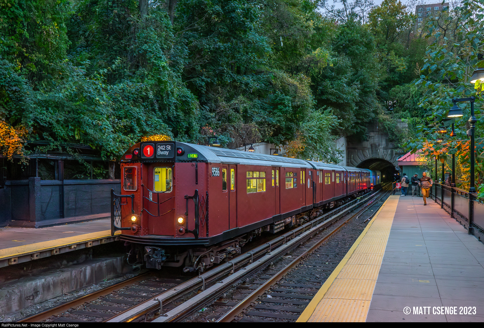 New York City Transit Authority (NYCTA) R36WF no. 9586 (St. Louis Car Co., 1963-1964) leads a NY Transit Museum out of the Broadway-7th Avenue Line portal at Dyckman St Station, while photographers on the platform attempt to reposition themselves for additional photo ops!
