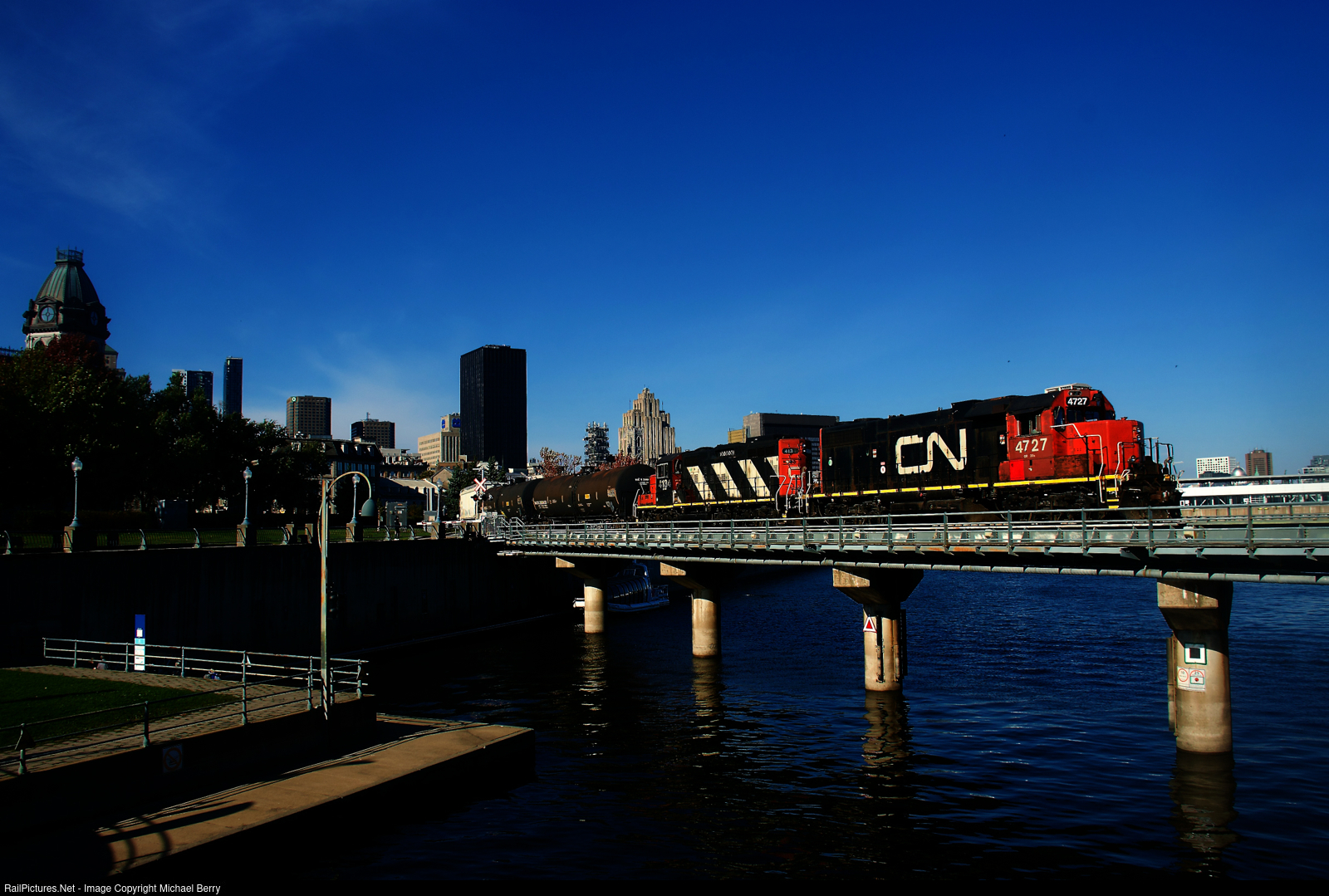 CN 4727 & CN 4134 are above the eastern end of the Lachine Canal as they shove cars into the Port of Montreal.