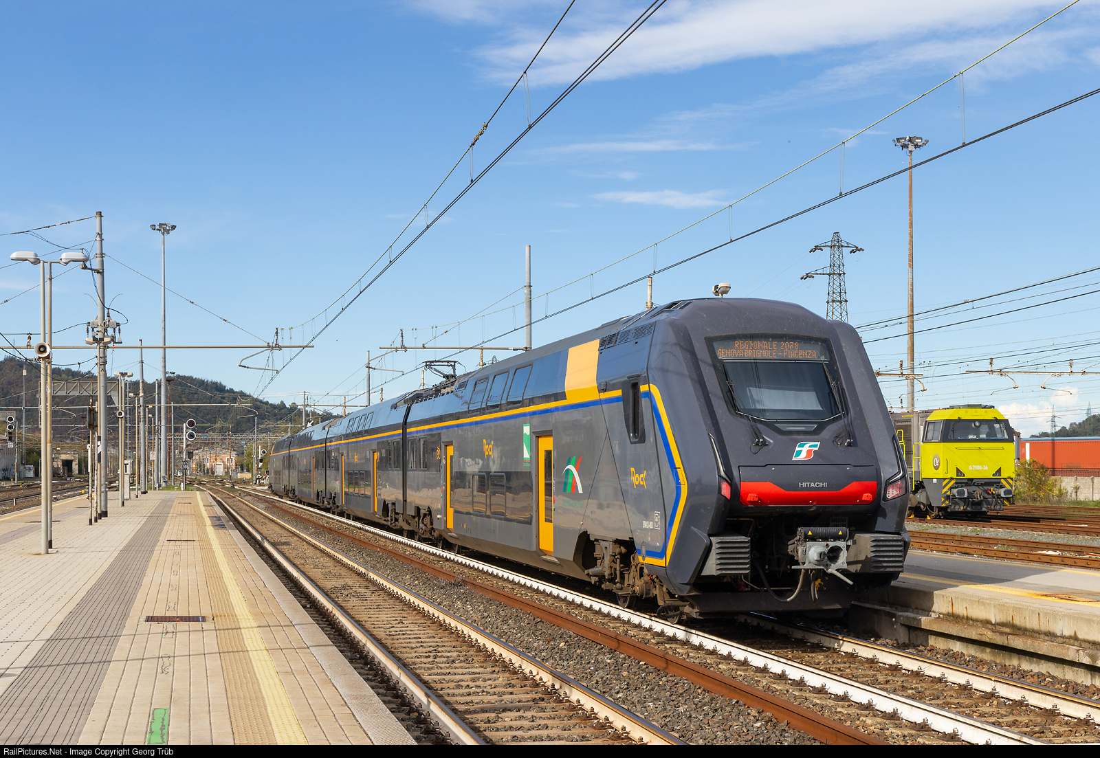 | Hitachi built doubledeck train "ROCK" ETR 421 # 003 of Trenitalia is leaving Arquata-Scrivia, running as regional train 2078 from Genova Brignole over the Giovi line to Piacenza. |