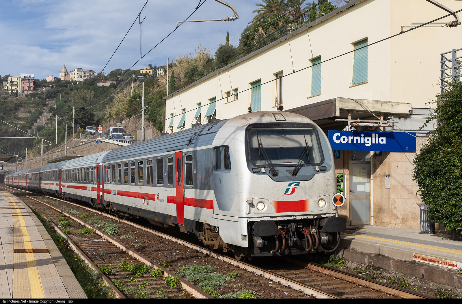 | Intercity 505 of Trenitalia from Ventimiglia via Genova-Pisa-Livorno to Roma Termini, is running through Corniglia in the Cinque Terre, with leading cab car and locomotive E 401 # 013 shoving in the rear. |