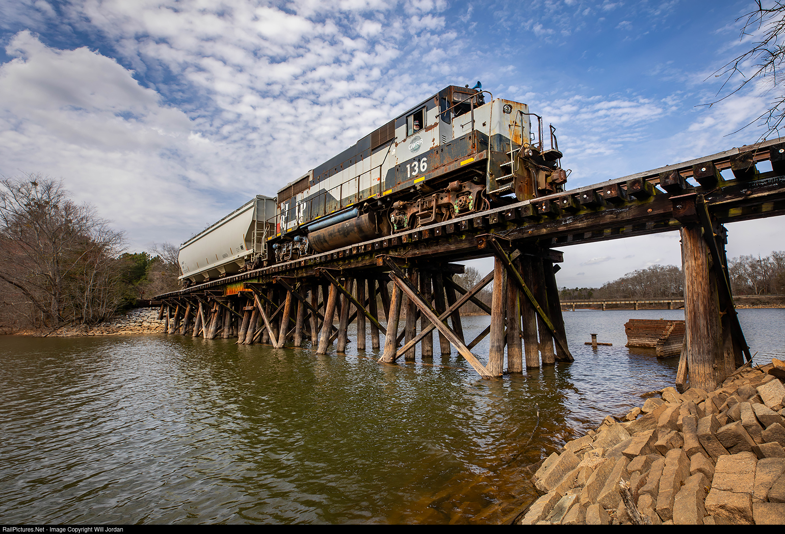 Former RF&P 136 is seen on one of its last runs ever crossing the lake coming into Hartwell with a hopper for Quality Holdings.