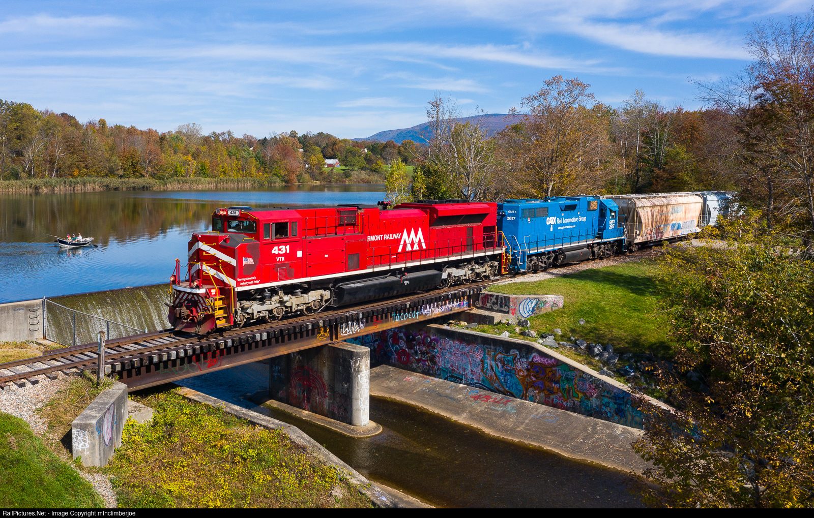 After spotting a few cars at Whitman's Feed in North Bennington, Vermont, the VTR's RDHJ job shove on to the Bennington Branch to pull a cut of hoppers out to take down to the Berkshire & Eastern interchange at Hoosick Junction. As a few fishermen row past, the train crosses of the bridge at the outflow of Lake Paran and gets on the move south.