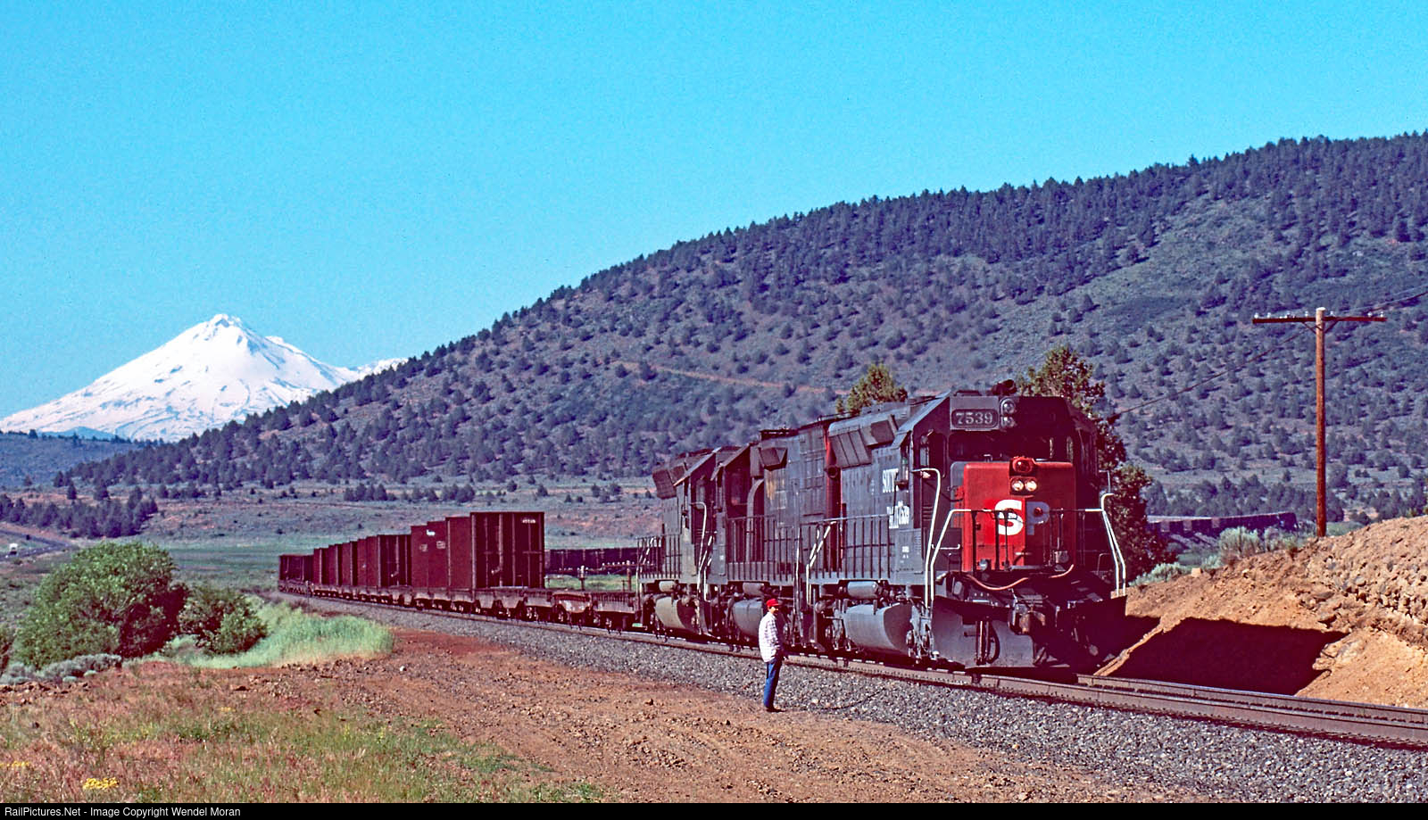 | A non-clearing eastbound Southern Pacific train holds short of a grade crossing, waiting for a westbound train to arrive at Worden, Oregon. |