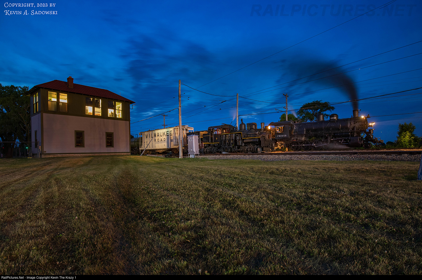 J Neils Lumber Co. #5 and Frisco 1630 are seen staged at Spaulding Tower for the Shay It Forward night photo session at the Illinois Railway Museum.