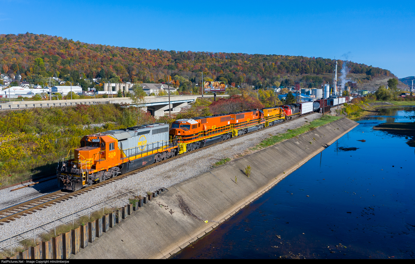 | Wellsboro & Corning SD40-2 309 leads the Buffalo & Pittsburgh's SIRI as it gets on the move south after working in Foster Brook. The train is rolling along the concreted bank of Tunungwant Creek as it passes through Bradford, Pennsylvania. CN 8800 is part of the day's consist as it is being transferred to the CN's operation on the former Bessemer. . |