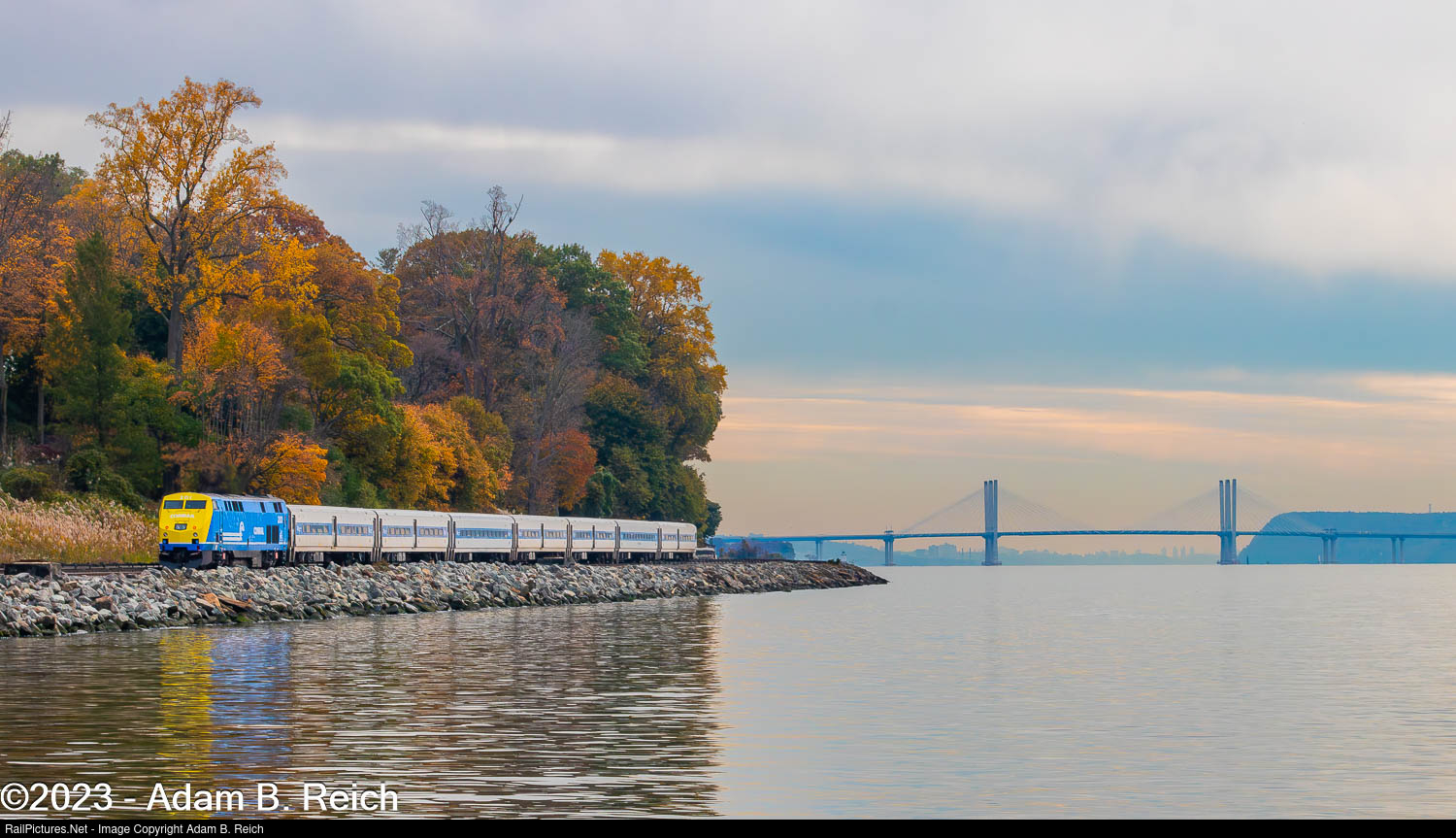 Off-Peak Color: Metro-North Railroad's Conrail heritage unit runs by past-peak foliage as it shoves a New York-bound weekend Hudson Line train along the Hudson River in Scarborough.