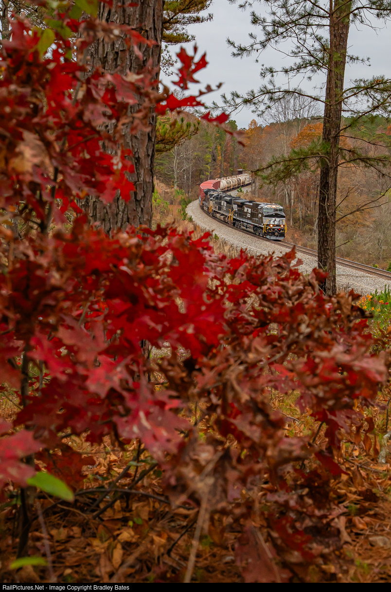 | The peak of Fall Foliage has almost come to an end for the season, but some vivid colors can still be seen in the Talladega National Forest. Newly rebuilt from NS C44-9W #9517, is AC44C6M #4720 leading train 187 westbound as they wind down the mountain at Cleburne, AL. on a cloudy November afternoon. |