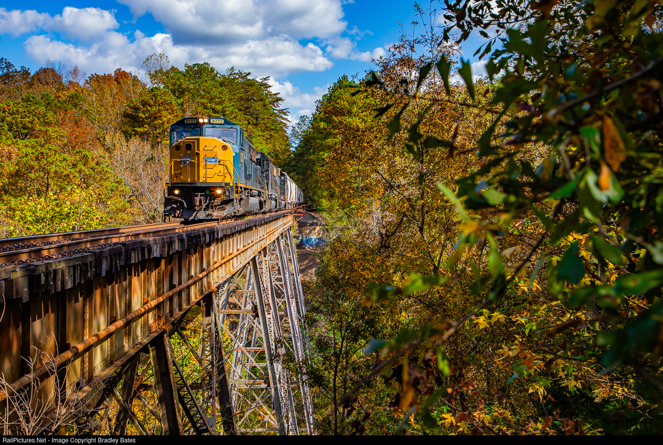 Alabama & Tennessee River Railway Train Z390 heads southbound across the Cahaba River Trestle near Trussville, AL. on their way to interchange with CSX in Birmingham.