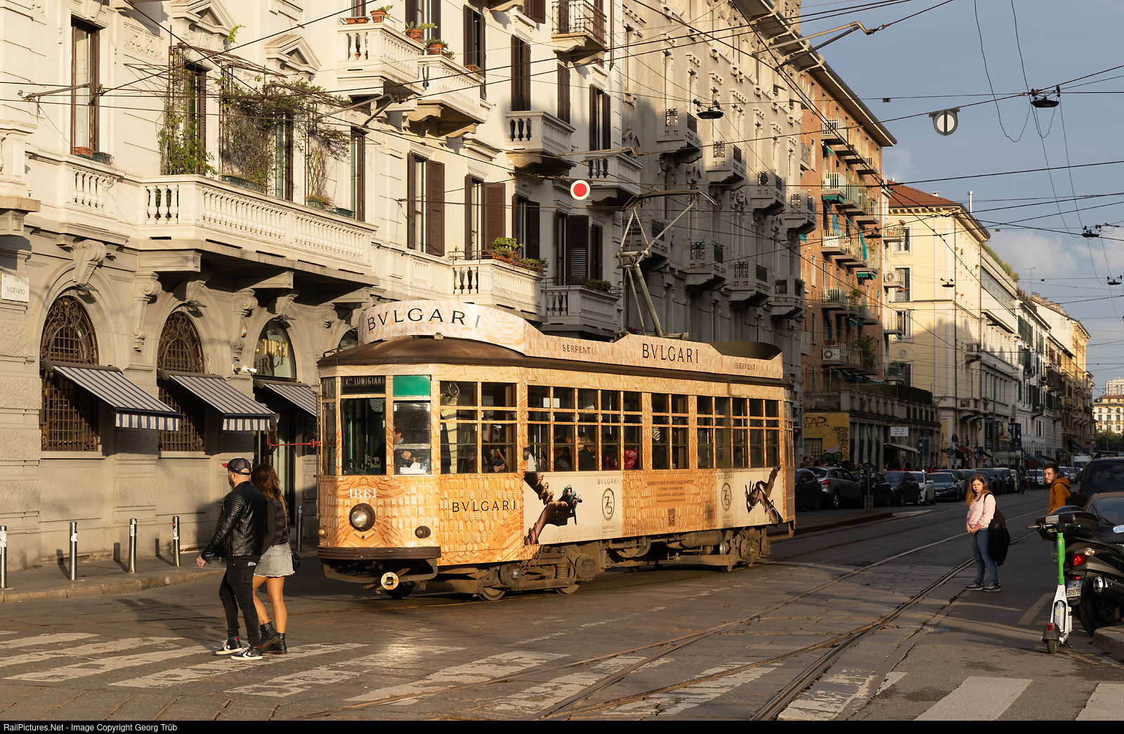 "Ventotto" (year of construction 1928) streetcar # 1661 (with Bulgary publicity) of the ATM Milano running on the line 10 from Piazza XXIV Maggio to Viale Lunigiana (near Milano Centrale), in the Via Vigevano at the Milano Porta Genova railway station. The Ventotto series is based on the Peter Witt cars built in the United States from 1914 onwards. A total of 502 of this "1500 series" were built between 1927 and 1930 and about 150 reconstructed since 2010 were still dominant in the streets of Milan.