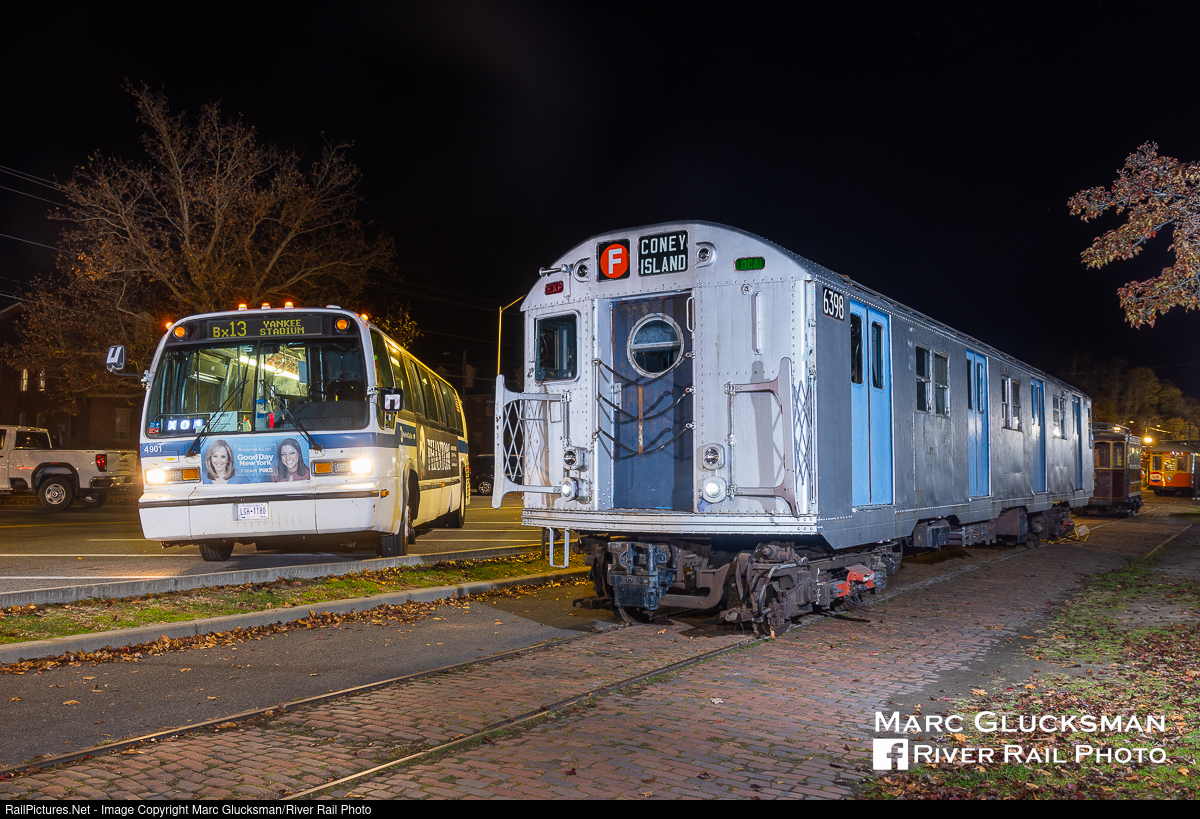 Subway Meets Bus. Former MTA NYCT Subway R-16 6398 and RTS 4901 are both part of the Trolley Museum of New York collection. With a little mix of the Bronx and Brooklyn, the two were posed next to each other. After dark on Saturday, November 11, 2023, the Trolley Museum of New York held a "Photographers Day And Night Event" in Kingston, New York. The museum was founded in 1955 and moved to its present Kingston location in 1983. The line and the collection offer an impressive amount of variety. For this part of the event, the cobblestone streets of Roundout Landing were selected near the Hudson River Maritime Museum and lined with trolley and subway cars (and even a bus!) from different cities. And though this was the first photography focused event that the museum has held in the modern era, it plans to have similar days in the future.
