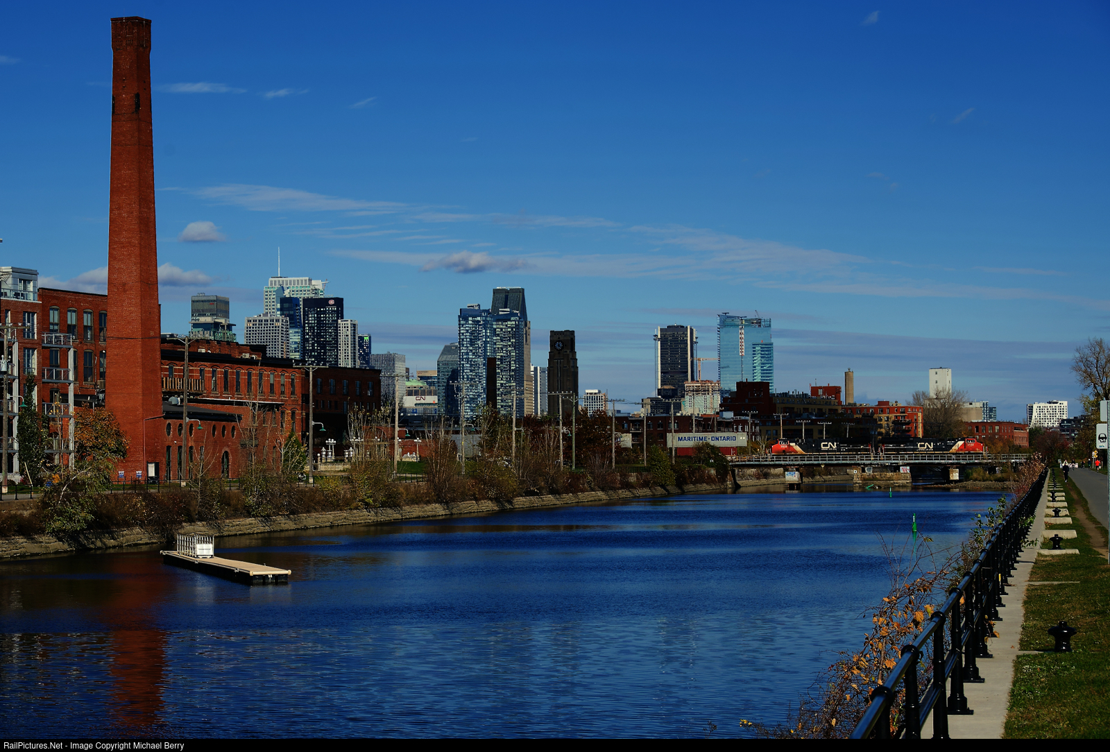 CN 120 has ex-GECX CN 3122 & CN 3028 up front as it passes the skyline of downtown Montreal.