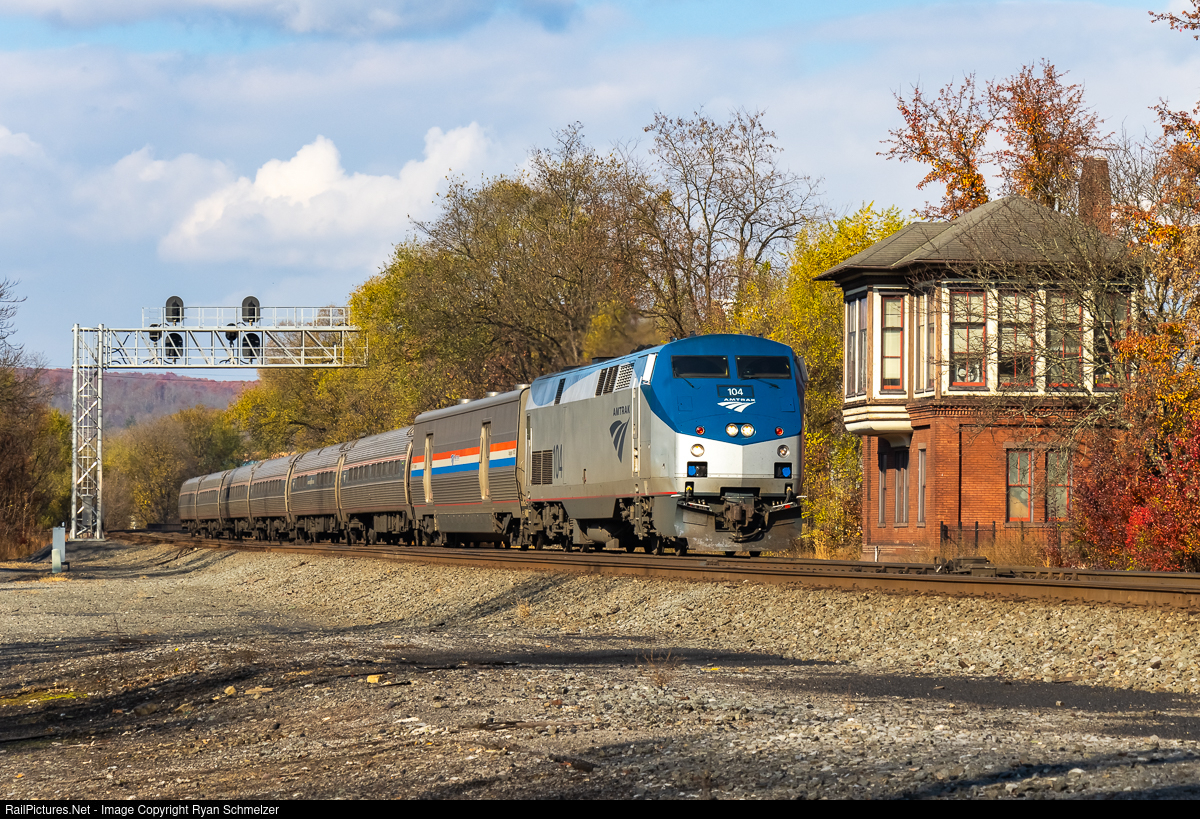 RailPictures.Net Photo: AMTK 104 Amtrak GE P42DC at Huntingdon, Pennsylvania by Ryan Schmelzer