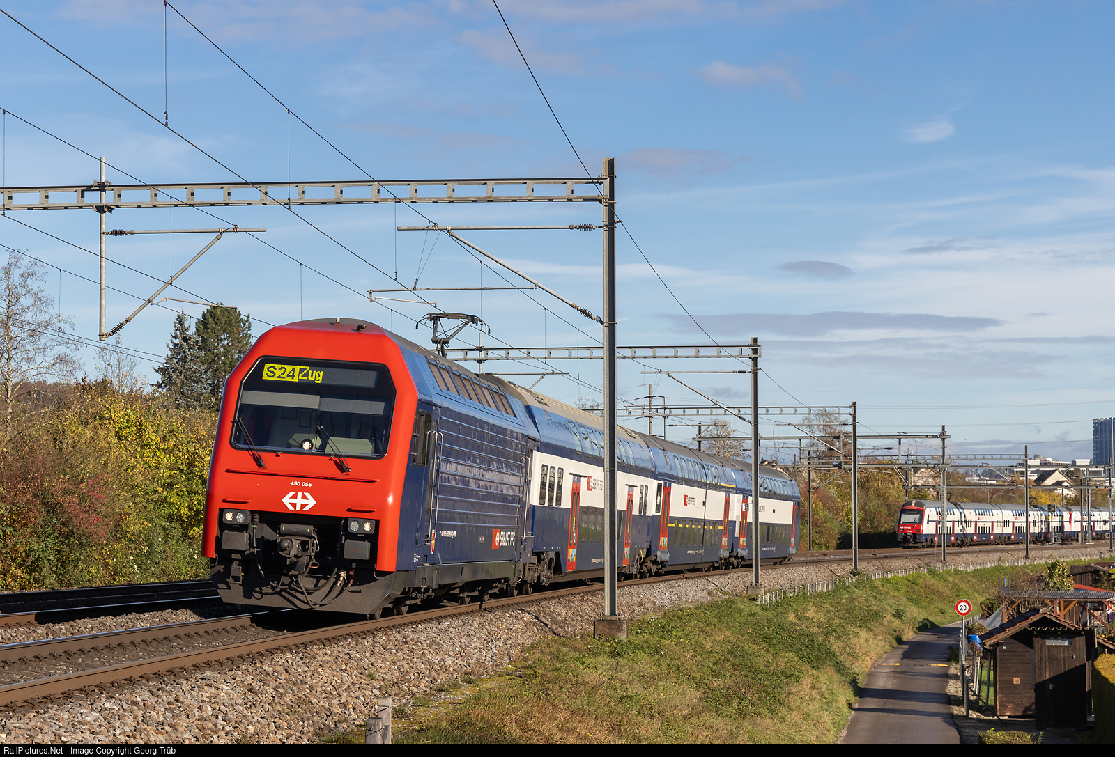 Re 450 # 055 with a DPZ+ doubledeck commuter push-pull train is running the S24 service 20437 from Thayngen via Schaffhausen-Andelfingen-Winterthur-Zürich Airport-Zürich HB-Thalwil to Zug, between Winterthur and Winterthur Tössmühle.