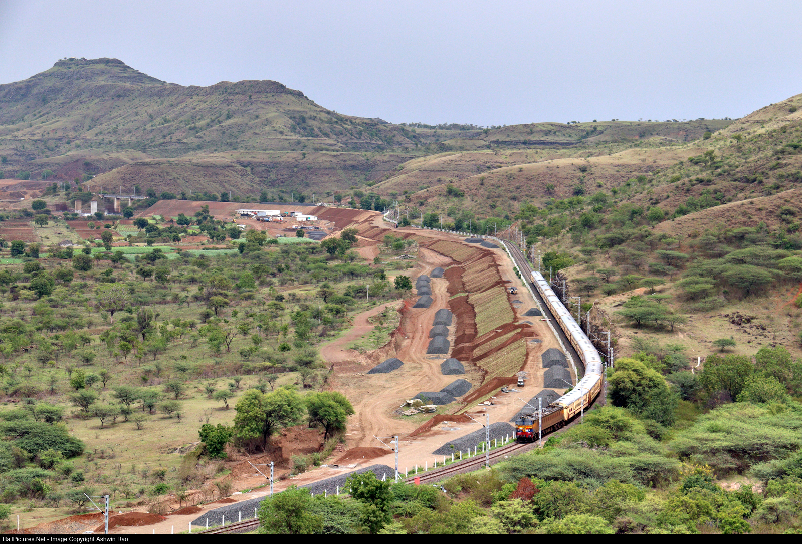 11030 Kolhapur Mumbai Koyna Express cruising though the scenic Shindawane Ghats between Ambale and Shindawane on Pune Miraj line. In the event of doubling the section the terrains are seen flatterned.