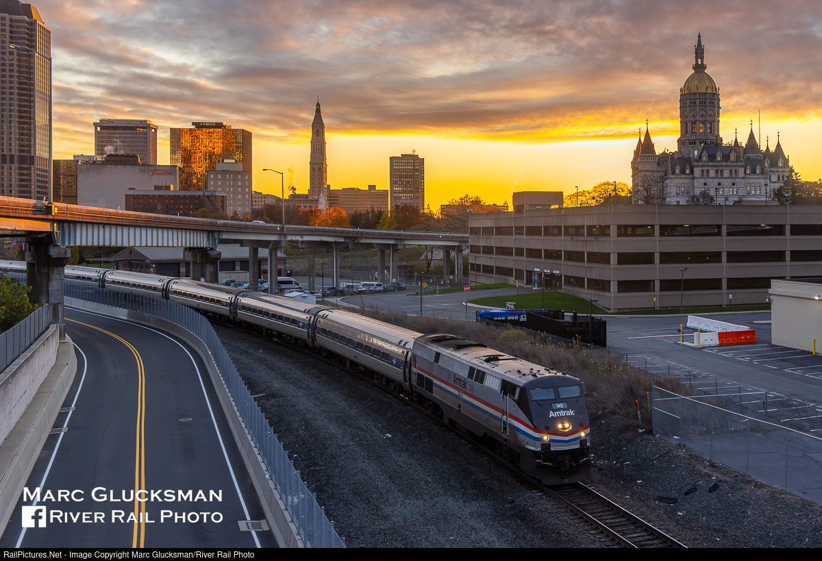 Sunrise At New England's Rising Star. The red, white and blue of the Phase III heritage paint scheme on Amtrak’s 40th Anniversary P42DC 145 passed through Hartford, Connecticut on the early morning of Sunday, November 12, 2023 on train 143 with the state capitol building in the background. The nickname "New England's Rising Star" was applied in the 1960s when the city was trying to attract various businesses and tourism. The city is one of the oldest in the United States, and is still well known as a center of insurance businesses leading to one of its other nicknames "Insurance Capital of the World", but is also home to notable higher educational institutions, medical facilities, and historic and cultural sites.