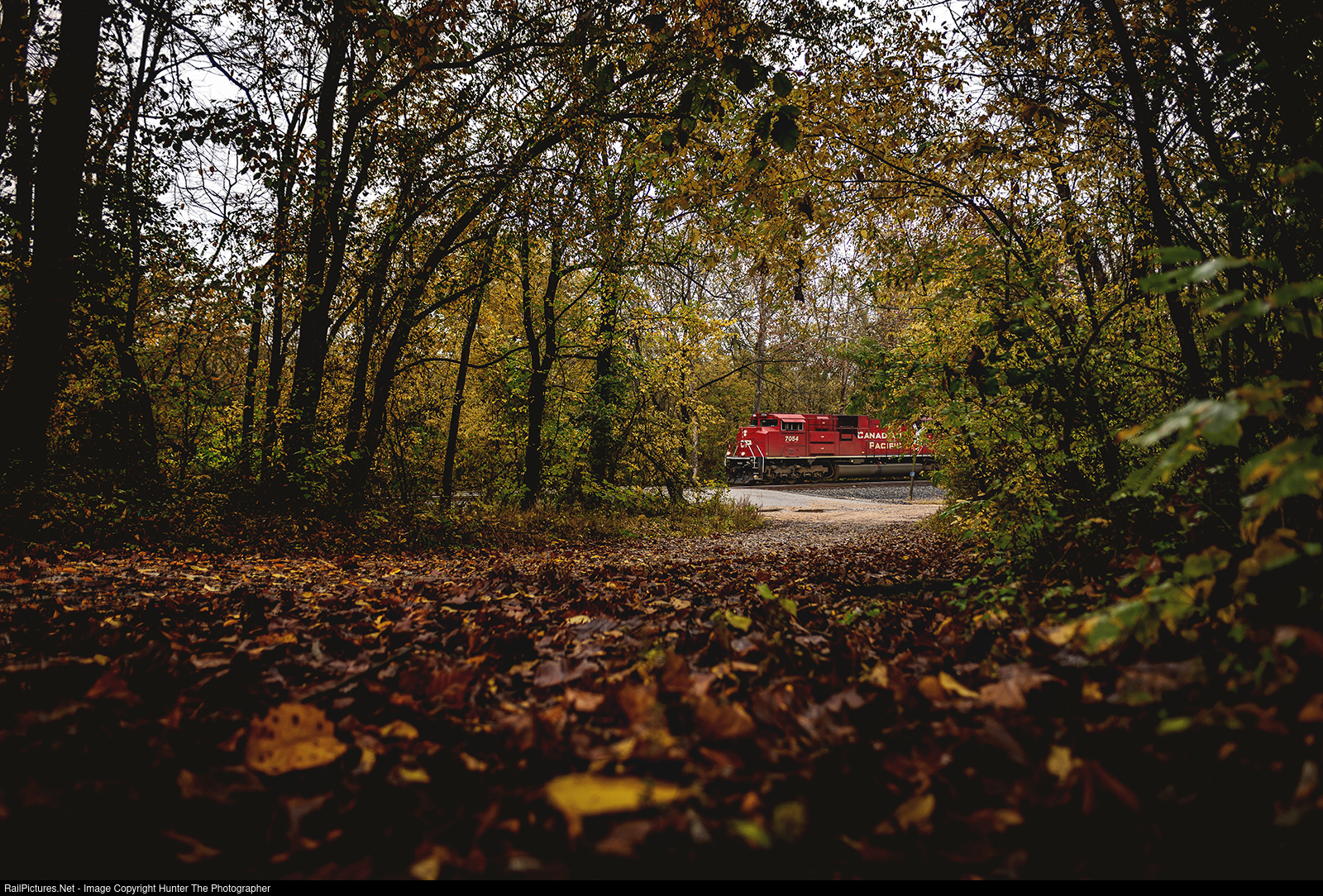 Canadians Heading North | Seen through a gap in the trees along a dirt road north of Watts, OK, Canadian Pacific SD70ACU leads northbound manifest train M263 out of the siding after working the yard in Watts on a chilly Sunday, October 29, 2023 afternoon.