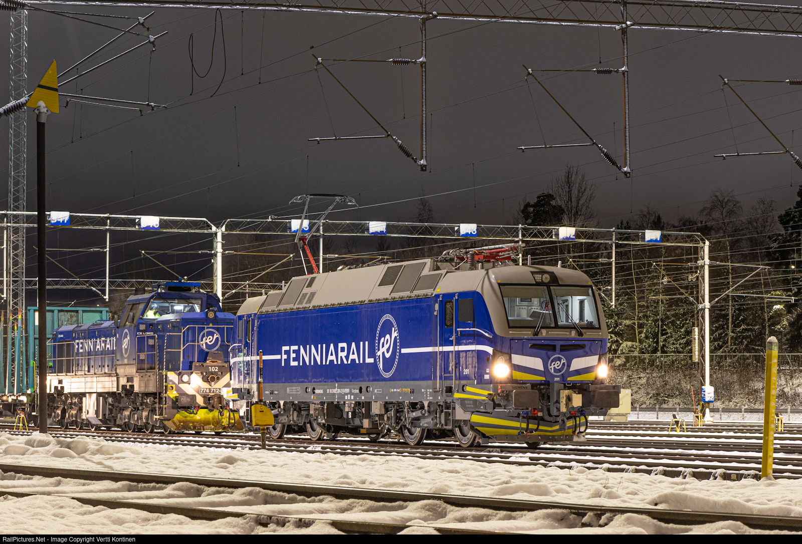 | Sr3 201 on it's first time visit to Tampere! The weekly Fenniarail freight train T 7123 from Kouvola to Haapamäki had the newest locomotive in the company's fleet pulling the train as part of the driver training for the new locomotives. As the line from Orivesi to Haapamäki is unelectrified, the stantard locomotive for the train, a Dr18 class diesel was there ready to haul the rest of the trip while the Vectron returned back to Kouvola