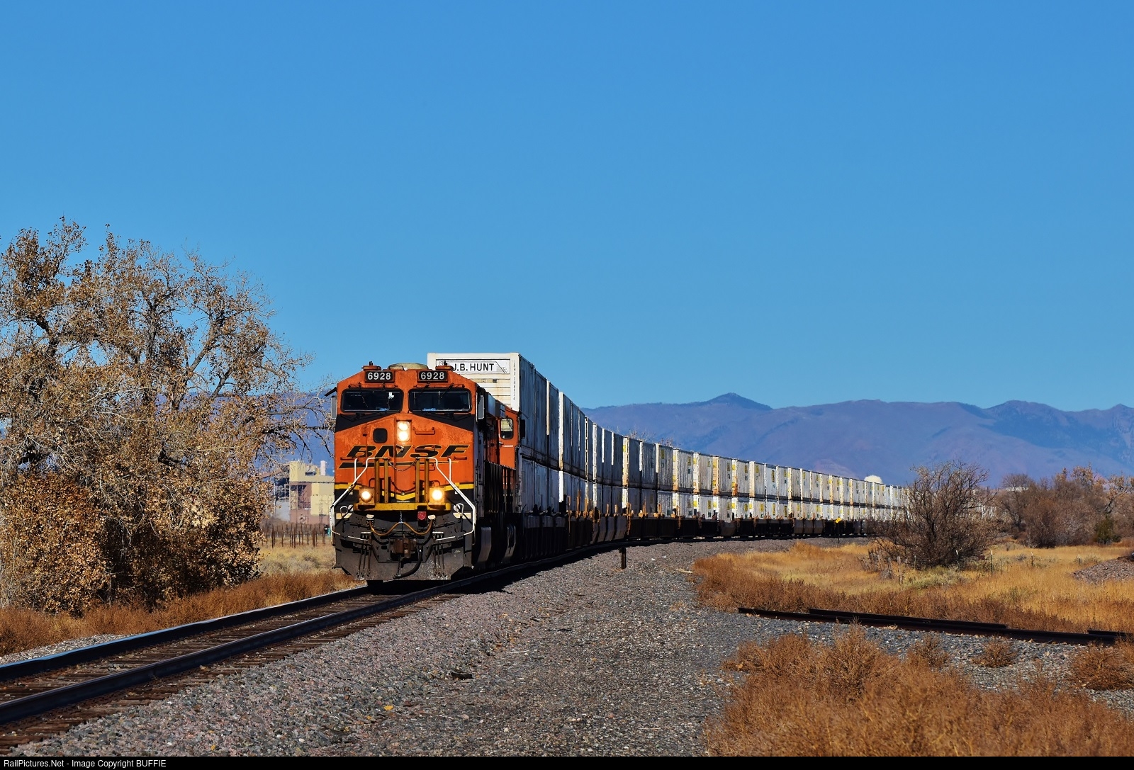 BNSF 6928 (ES44C4) leads a stack train through Nixon, Colorado on its way to Pueblo.