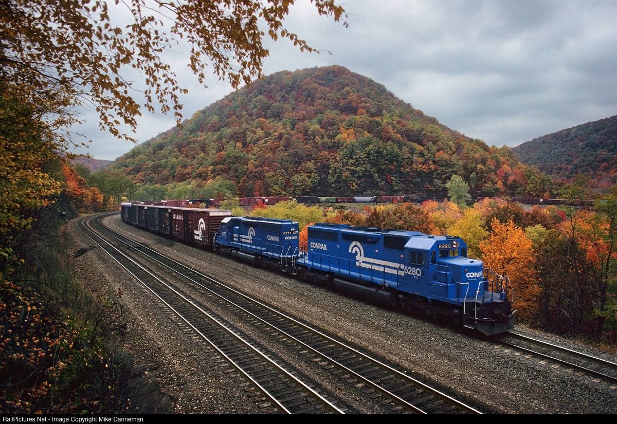 Conrail EMD SD40 Nos. 6280 and 6277 helper locomotives are on the rear of an eastbound freight, assisting with braking on the Allegheny Mountain crossing west of Altoona, Pennsylvania, on October 21, 1988. The train is rolling through famous Horseshoe Curve, and besides helping the train downgrade, it’s a convenient way to get the helper units back to Altoona for another push.