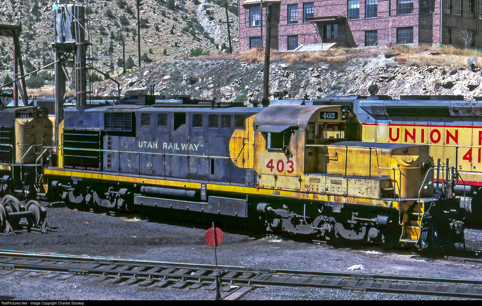 MARTIN UT August 9 1981. — Utah Railway RSD15 403 idles at the engine facility while awaiting its next coal train assignment. The alligator was built by Alco as Santa Fe 847 (b/n 83057) in June 1960 in blue body with yellow ends (bookends) with blue herald on the nose. As part of the Santa Fe’s general renumbering it became ATSF 9847 on Oct 10 1962. Sometime after its renumbering it was repainted in blue body with yellow warbonnet and blue herald on the nose. Santa Fe retired the unit on Jan 15 1975 and sold it on that date to Precision National Corp, Mount Vernon IL with PNC acting as a dealer for the Utah’s RSD-15s. The 403 was acquired by Utah Railway on Oct. 28 1975. On Oct 31 1975 it was shipped to Utah from the PNC facility and entered service on the Utah still in its yellow warbonnet. Its last day of service on the Utah was May 13 1982. It was retired on May 14 1982 and was sold for scrap in November 1983 to Industrial Salvage & Metals (Salt Lake City UT) and scrapped in early January 1984. A huge thank you to the utahrails.net and http://old.atsfrr.org/resources/CrossetGene/ Web sites. My photo.