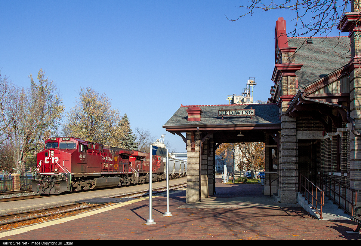 | CP 8038 leads a westbound sand train past the former Milwaukee Road passenger station at Red Wing, MN. The station is still in use by Amtrak. CP 8038 is a rebuilt AC44CW, originally built in August 1995 as CP 9511. |