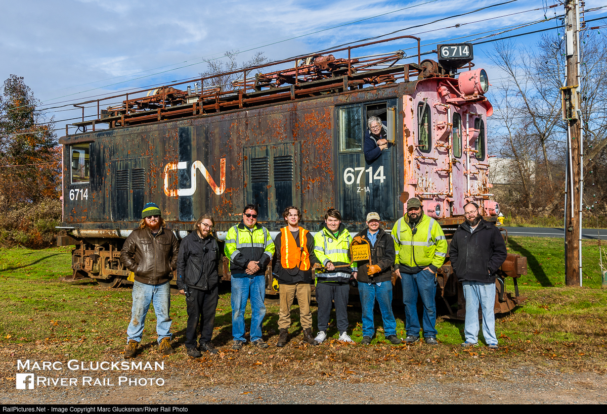 Say Goodbye. On November 12, 2023, Canadian National Railway Company Box Motor 6714 (née-Canadian Northern 604, Z-1a, GE, 1917) was moved from its place on the display track near North Road in East Windsor, Connecticut at the Connecticut Trolley Museum on November 12, 2023, culminating the long term effort to find a better home for the veteran electric. After serving over seven decades transporting the commuters of Montreal, the locomotive was retired and brought to the museum. Its acquisition was during a different era in the museum's curation, and the decision was made to find a better home. The Halton County Radial Railway in Rockwood, Ontario stepped forward to adopt the motor. The locomotive was moved by Oshawa Railways Steeple Cab Electric Locomotive No. 18 (Baldwin/Westinghouse, 1918) making its first run since 2006, assisted by Hartford Electric Light Co. 1 (GE, 25T, GE, 1949). Before the move, the group posed for a pic by North Road with noted railroad museum volunteer Bill Wall hanging out the window of the cab and smiling.