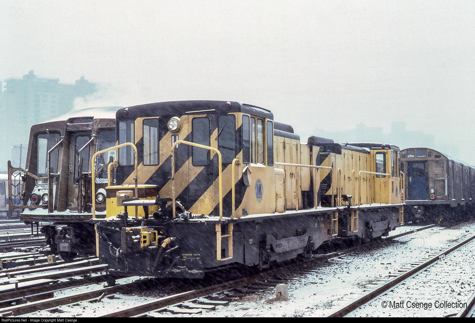 Resting in the New York City Transit Authority (NYCTA) Coney Island Yard during a snowstorm on January 13, 1982 are 35-ton locomotives 11 and 10. The locomotives were built by GE in 1959 and were originally used to power the Speno rail grinding train. No. 11 was scrapped in December 2000, but no. 10 is preserved in the NY Transit Museum collection.