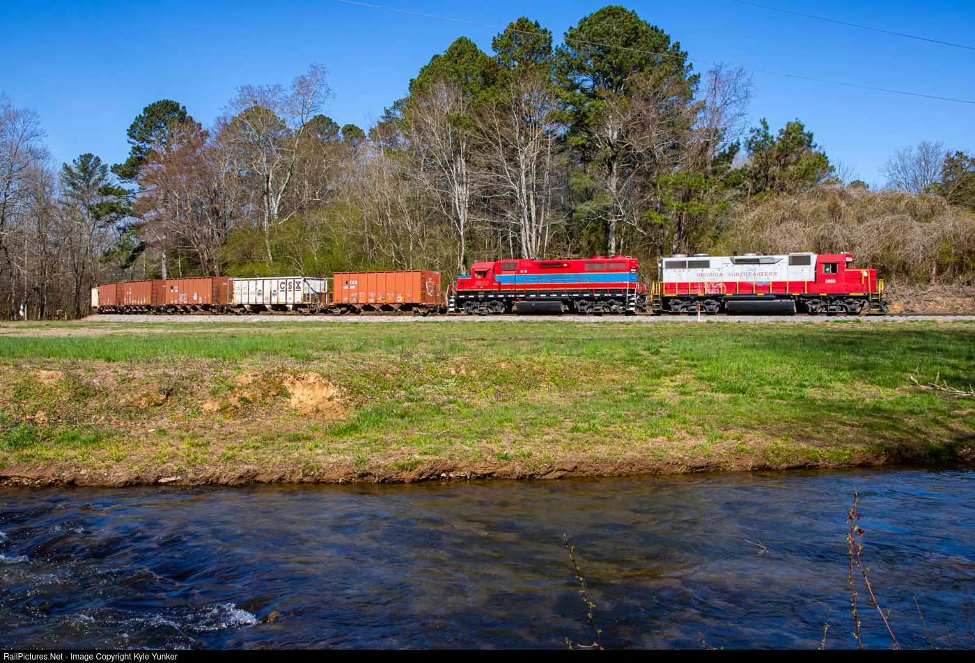 | A pair of Patriot Rail owned GP38-2s in the form of GNRR #2000 & CLC #3810 bring a dozen loads of crushed marble from Imerys' Whitestone operation south through the quiet mountain town of Talking Rock |
