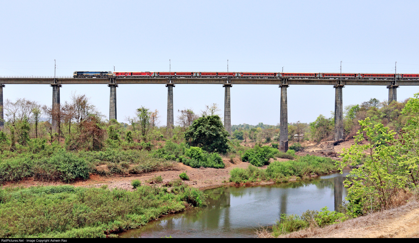 10103 Mumbai CSMT Madgaon Mandovi Express cruising though the tall and a slighthly curvey Gad river bridge near Sangameshwar, Ratnagiri. Konkan Railway.