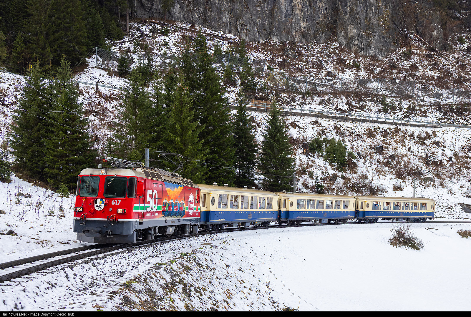 Ge 4/4 II # 617 of the Rhaetian Railway, in the publicity paint scheme for 50 years LGB Gartenbahn, pulls the special 92425 from Landquart via Chur to Arosa, near Litzirüti. The cars are the "ALPINE CLASSIC PULLMAN EXPRESS" parlor cars As # 1142 to # 1144, built in 1931 by the SIG Neuhausen for the Montreux Oberland Bernois (MOB). The Ge 4/4 II # 617 is due to be stabled from end of this year, because it lacks the new train protection system ZSI 127.