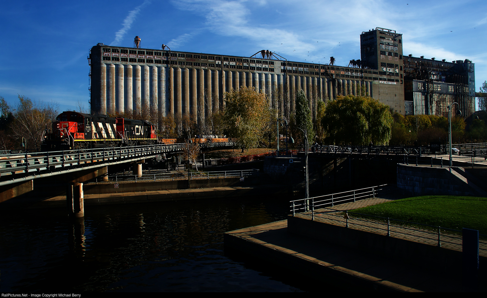 | Still earning its keep after decades of service, GP9 CN 4129 leads a baretable move into the Port of Montreal, with CN 4727 |