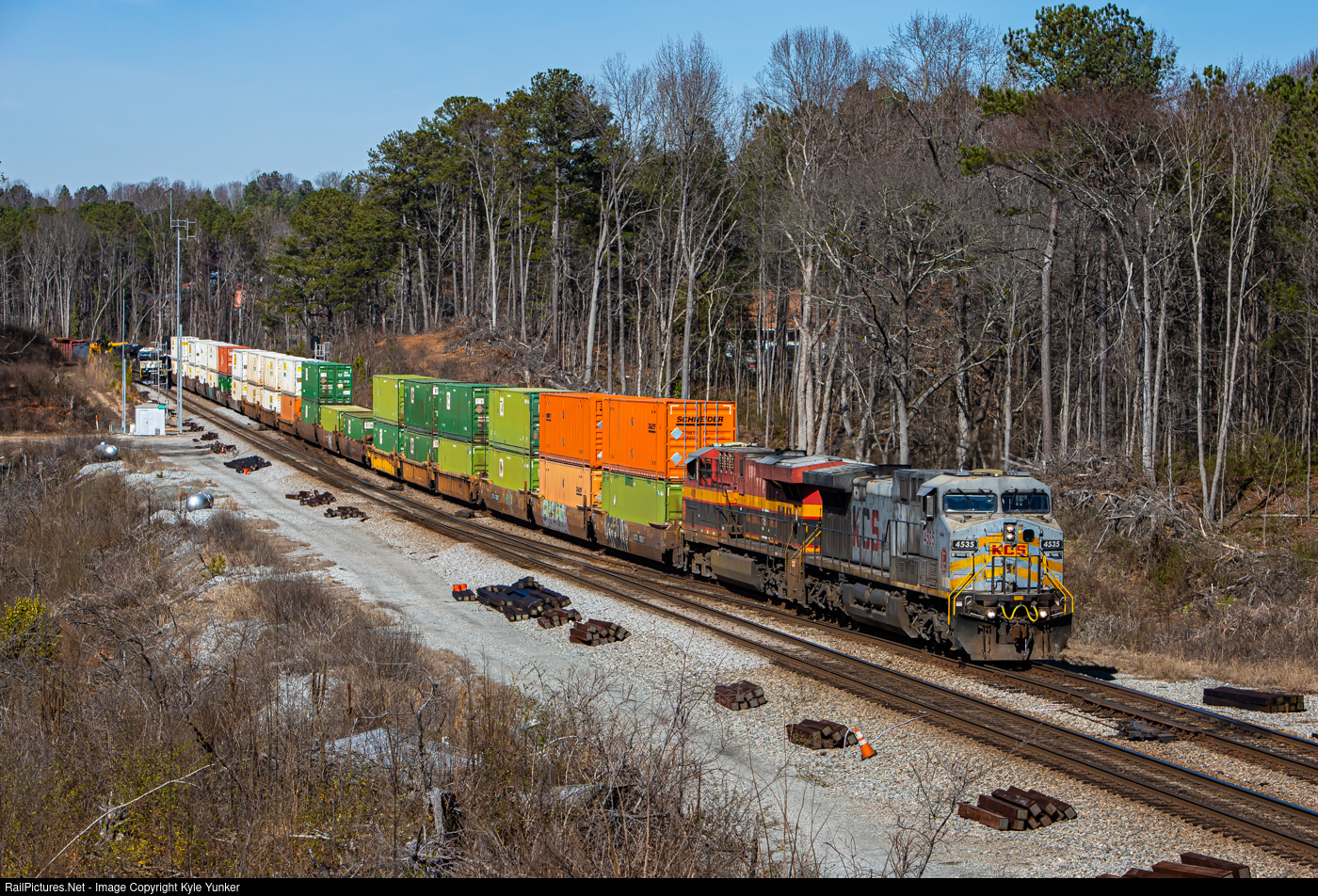 KCSM #4535 still in its as delivered grey paint leads NS #244 through 'Jac Mac' nearing its destination of Norfolk Southern's Inman Yard
