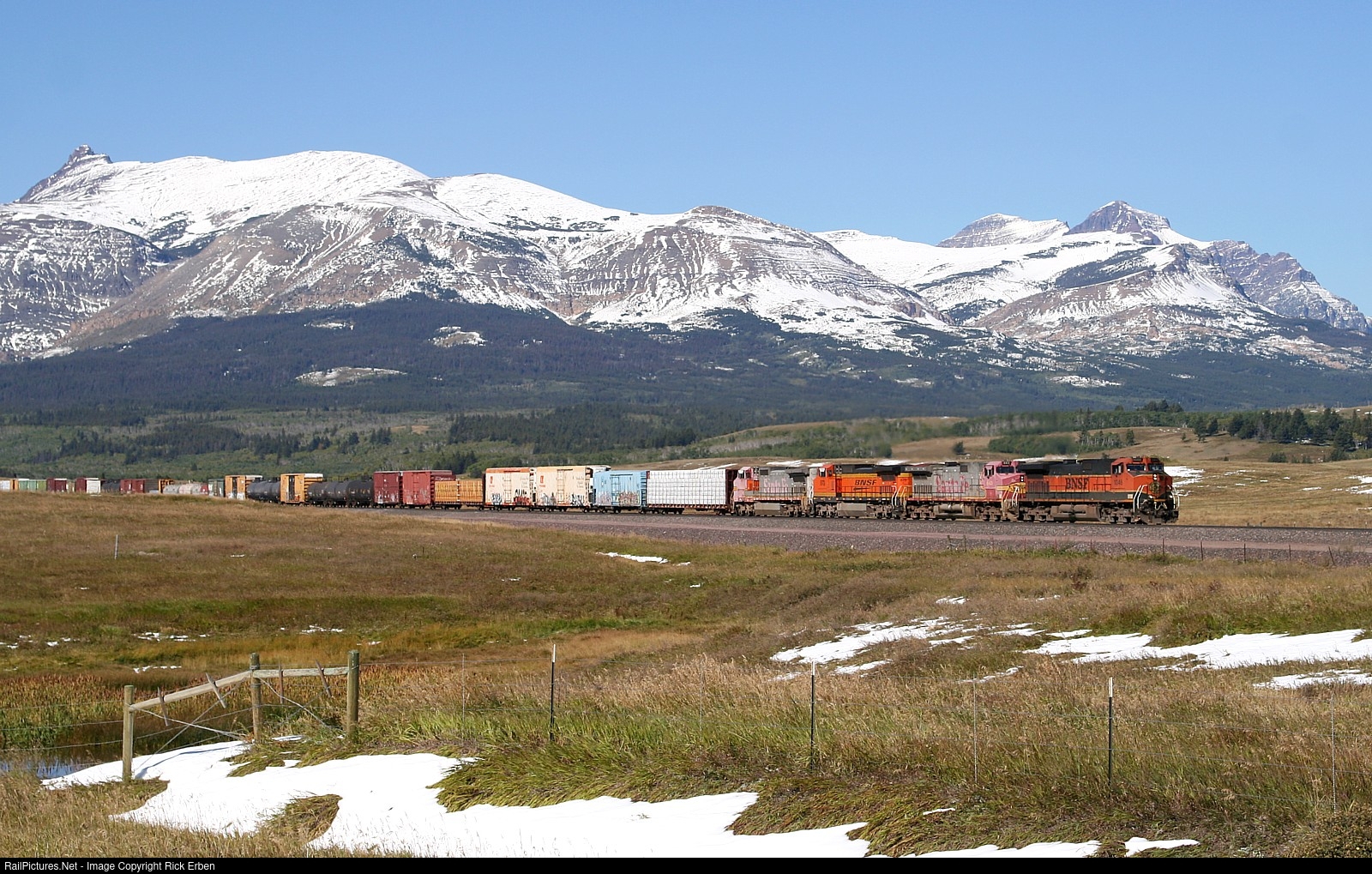 A quartet of GEs are in charge of an eastbound manifest pulling the grade east of East Glacier and the Two Medicine bridge as they approach the control point at Grizzly, MT. The mountains of Glacier Nat'l Park have a coating of September snow this late summer day.