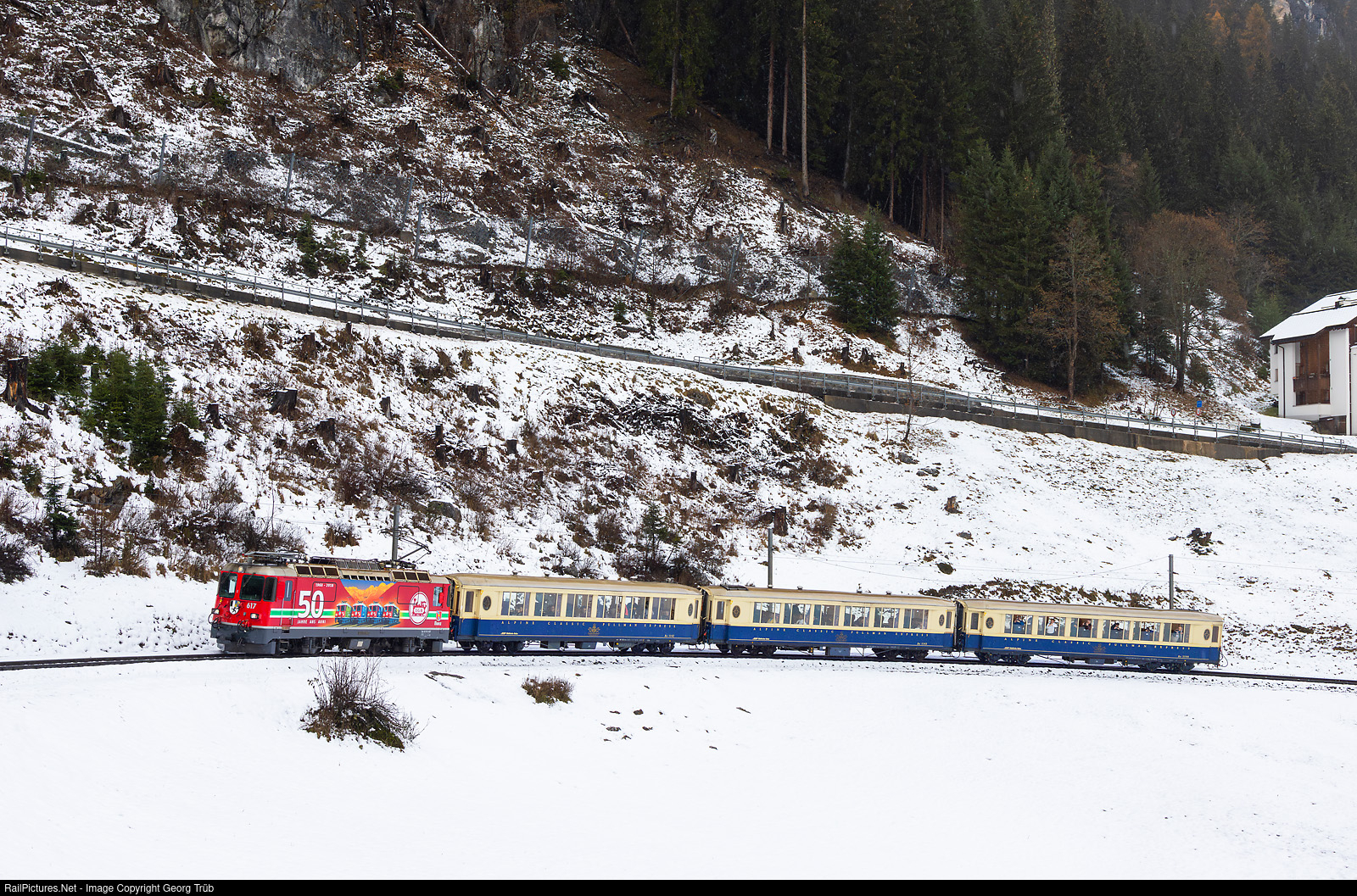 Ge 4/4 II # 617 of the Rhaetian Railway, in the publicity paint scheme for 50 years LGB Gartenbahn, pulls the special 92425 from Landquart via Chur to Arosa, near Litzirüti. The cars are the "ALPINE CLASSIC PULLMAN EXPRESS" parlor cars As # 1142 to # 1144, built in 1931 by the SIG Neuhausen for the Montreux Oberland Bernois (MOB). The Ge 4/4 II # 617 is due to be stabled from end of this year, because it lacks the new train protection system ZSI 127.