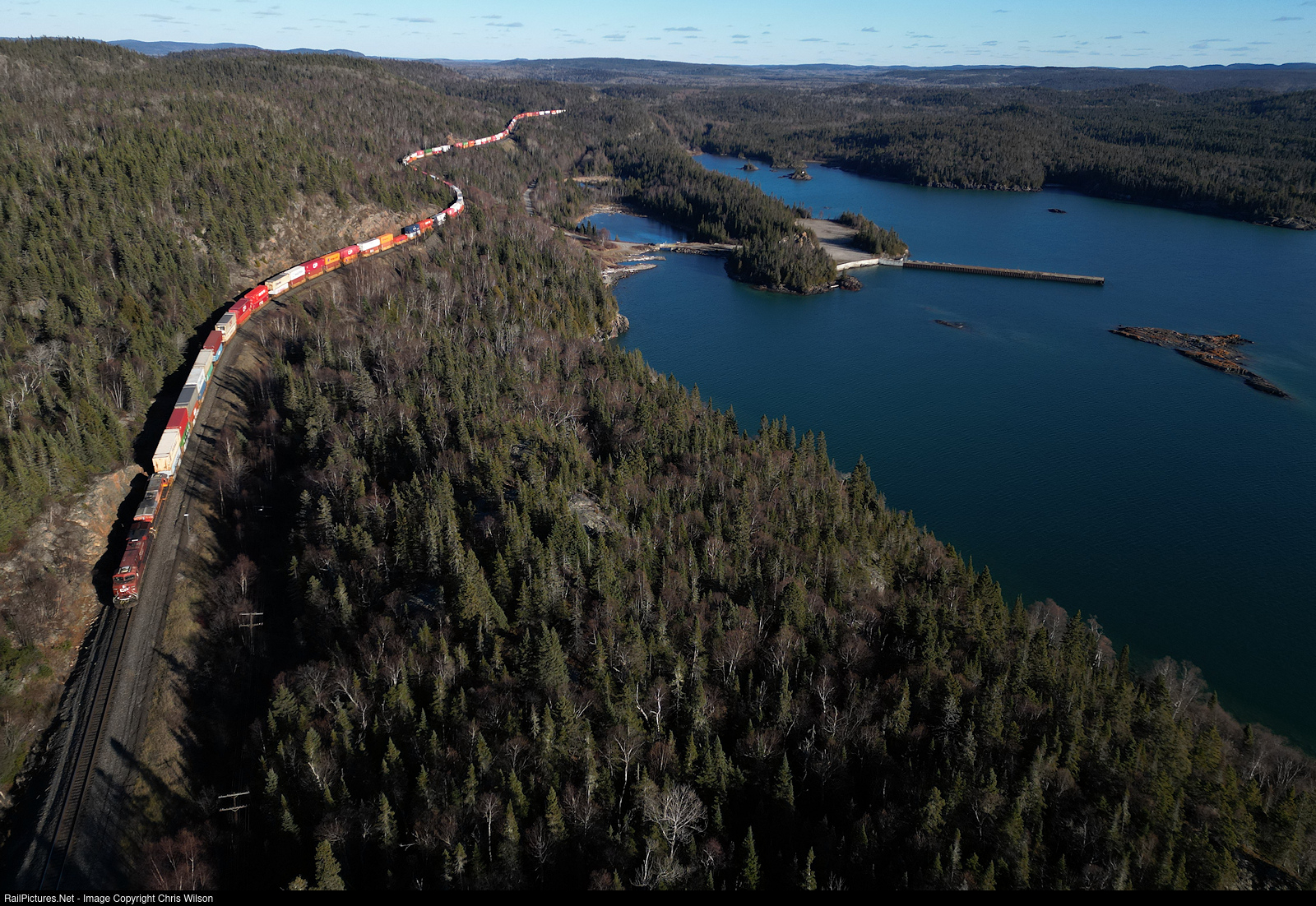 | CPKC's hotshot Toronto, Ontario to Vancouver, BC intermodal begins the 200 mile run along Lake Superior just west of Heron Bay. |