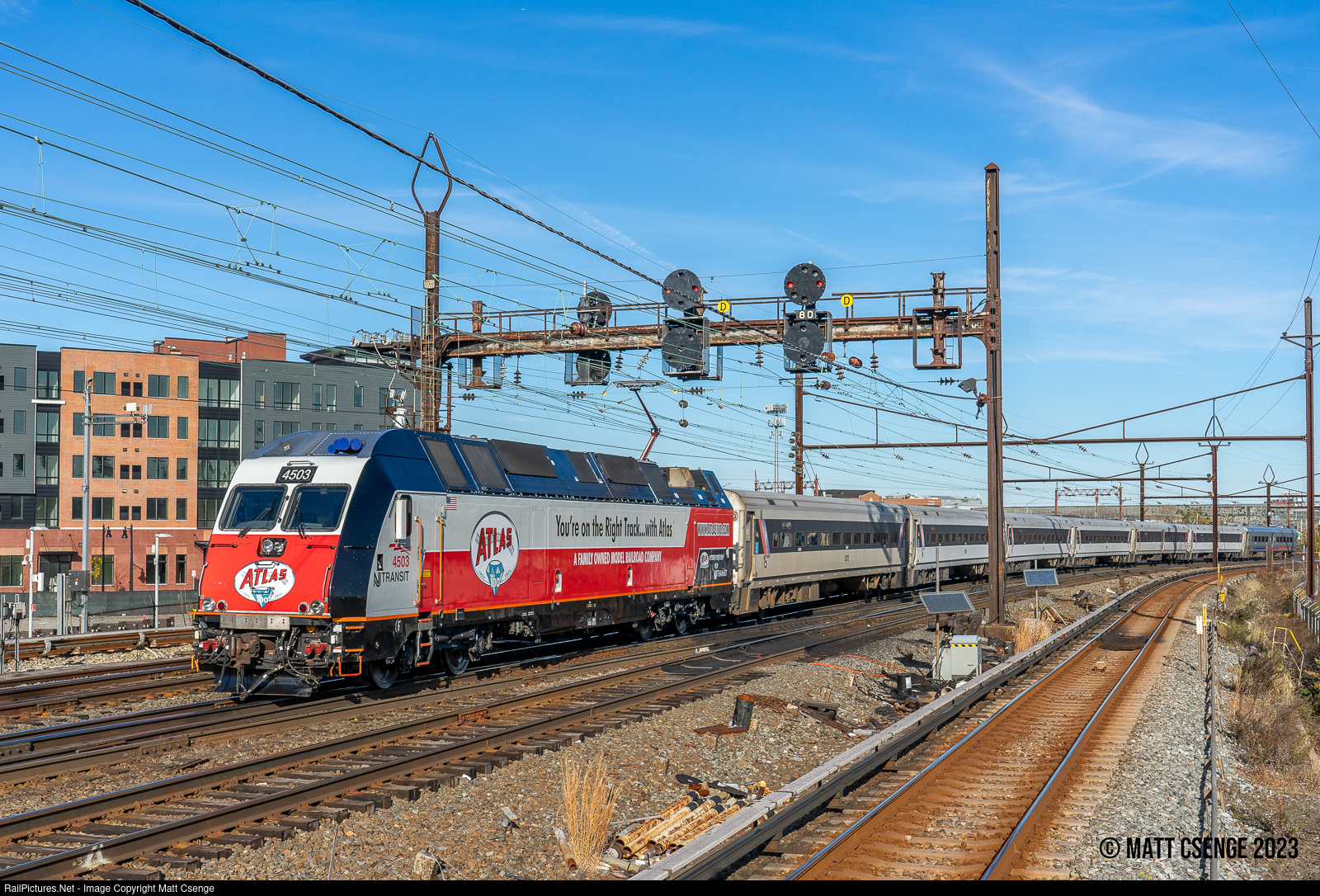 NJ Transit ALP-45DP no. 4503 (Bombardier, 2010-2012) was on Raritan Valley Line train 5176 on November 20, 2023, seen here passing Harrison Station on the Northeast Corridor. The locomotive is adorned with a wrap advertising New Jersey-based Atlas Model Railroad Co., which is celebrating its 100th Anniversary in 2024! For those who want one for themselves, but don't have room for a 1:1 scale version, Atlas is also offering them in HO scale (1:87) and N scale (1:160).
