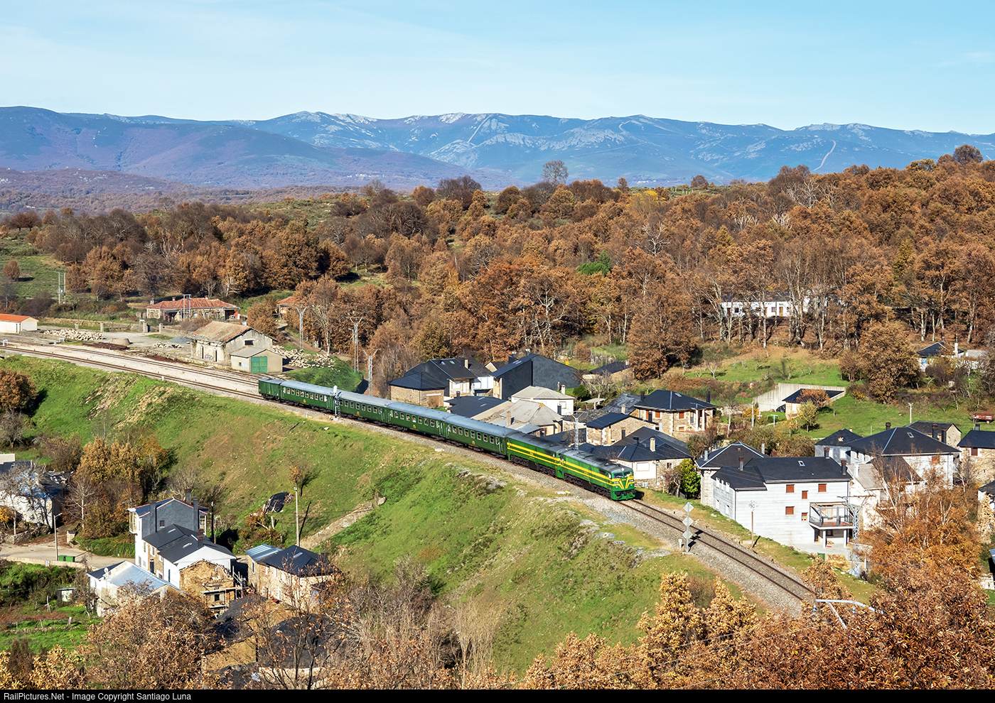 Charter train rented by PTG Tours on its route between Madrid and Ourense. This was the first passenger train that has circulated here in the last two years. Since then, the Alvia trains have circulated on the High Speed line and only two freights circulate in this area weekly (and not always) in each direction.