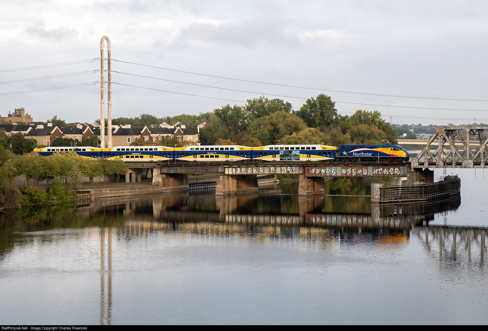 The second morning train from Big Lake shoves into Minneapolis over the Great Northern Mississippi River Bridge on the morning of September 27, 2023.