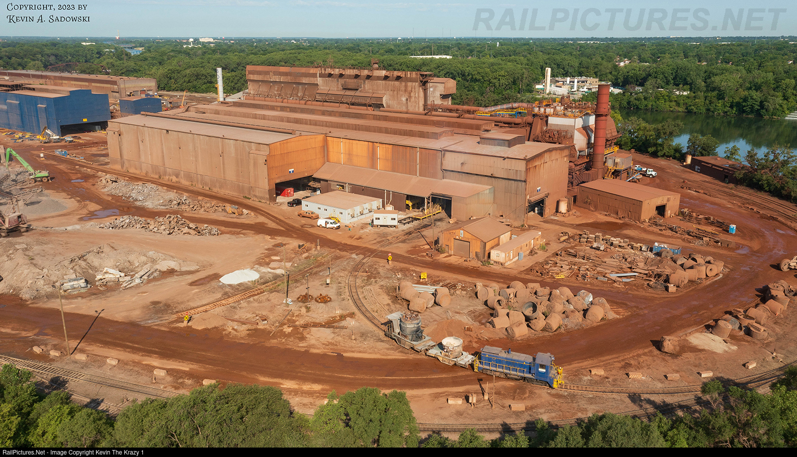 A Cleveland-Cliffs (SW8?) is seen pulling a pair of ladle transfer cars at the Riverdale plant.