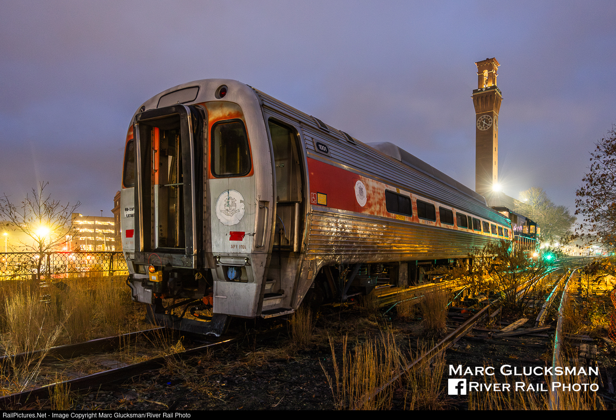 SPV Moves On Metro-North. In the early morning hours of Saturday, November 18, 2023, MTA Metro-North Railroad "Work Extra 107" transported former CDOT SPV/Constitution Liner 1001 from The Danbury Railway Museum in Danbury, Connecticut to the Naugatuck Railroad/Railroad Museum of New England in Waterbury/Thomaston, Connecticut. In 1981, 13 Budd SPV-2000s were built Connecticut DOT, Budd's successor to the RDC. After serving briefly, they were found to be unsatisfactory and withdrawn from service. Subsequently, 11 of these cars were converted to "Constitution Liners" (basically de-powered SPVs as coaches). Car 1001 became a conference car, retaining cab controls at one end. After retirement, it was purchased by a private owner and stored at the Danbury Railway Museum. This transfer, using MNCW GP-35r 107 (née-SOO 728, GP35, 5/1965, EMD) brought the car to the Railroad Museum Of New England/Naugatuck Railroad, where it will be used in passenger service in the near future. The car has arrived at the division post with Metro-North at Waterbury, Connecticut with the famed Waterbury Clock Tower in the background.