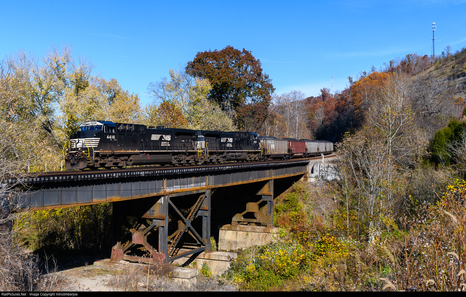 | A pair of AC44C6M's lead loaded Norfolk Southern coal train798 as it emerges from a rock cut and cruises across the bridge over Elijah Creek as it approaches Prichard, West Virginia. This section of the Kenova District from Kenova to Fort Gay follows the valley of the Big Sandy River. |