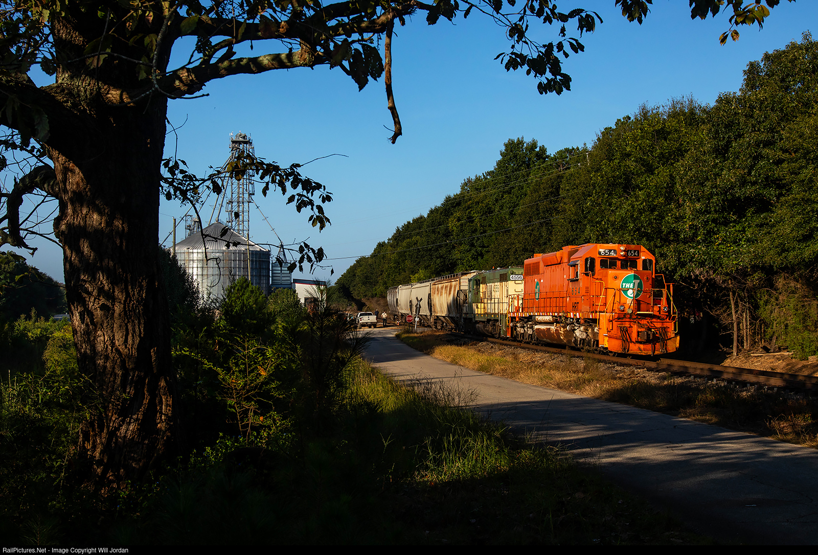 The morning sun lights up a pair of classic motors on the Hartwell Railroad as they get their day started at the Rose Acre feed mill in Bowersville.