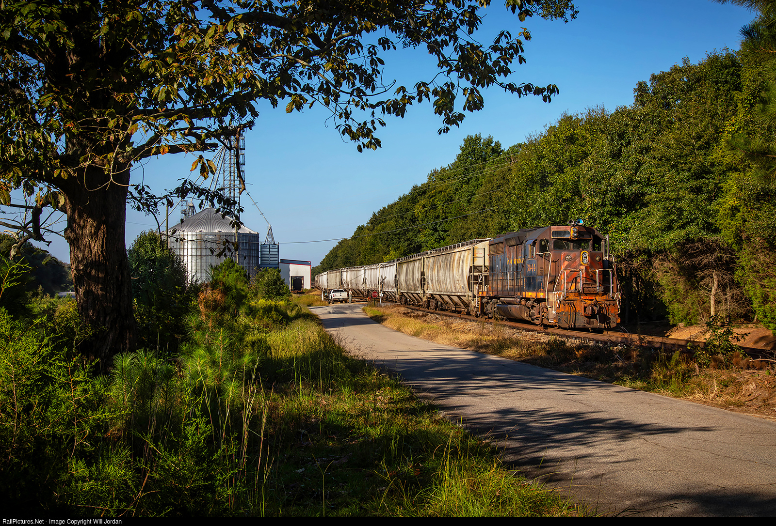 Former Rio Grande GP35 No. 3044 is switching at the Rose Acre feed mill in Bowersville on a pleasant summer morning.