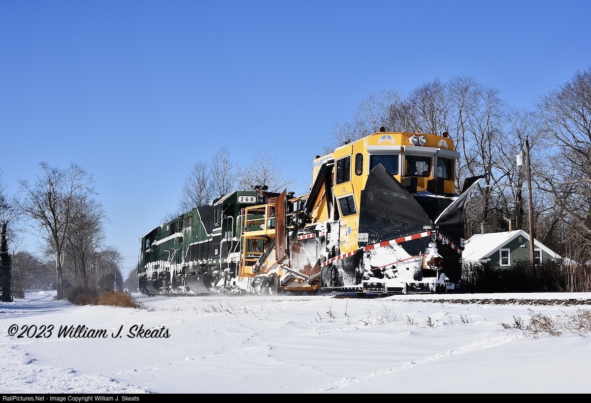 | NYAR GP38-2's 268 & 261 pushing Darth Vader(nickname for LI 4230 Harasco Ditcher/spreader) plow through the snow at R Block in Jamesport. Winter Storm Keenan the plow worked from Ronkonkoma to Greenport on the LIRR Main Line. |