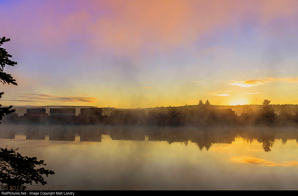 During a golden sunrise, train 120 rumbles through a beautiful Folly Lake, Nova Scotia.
