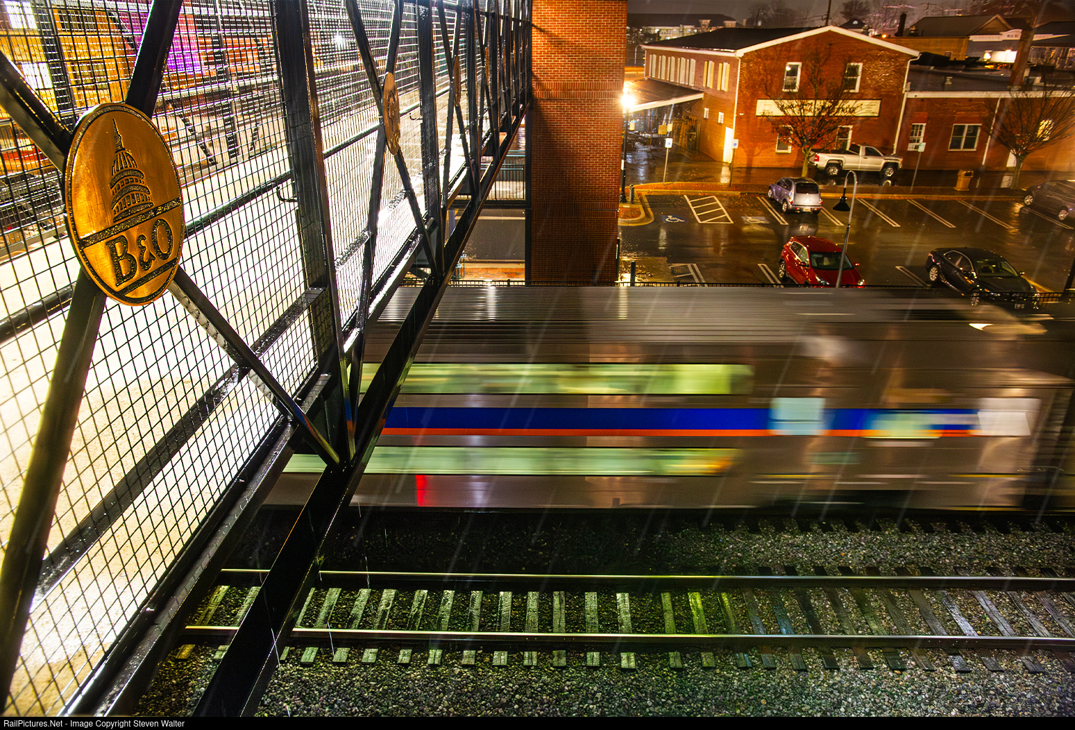 As the rain pours down, MARC P877 departs the Gaithersburg MARC Station, passing under the pedestrian bridge adorned with B&O and City of Gaithersburg emblems.
