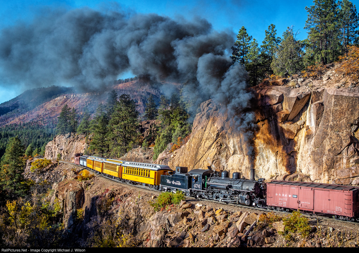 | Denver & Rio Grande Western K-28 #476 marches along the High Line at Granite Point on October 16, 2023 as she works hard to help a mixed train north to Silverton, Colorado. With new valve rings and canyon walls to help resonate the snug fit, #476 certainly makes for quite the sonic experience. |