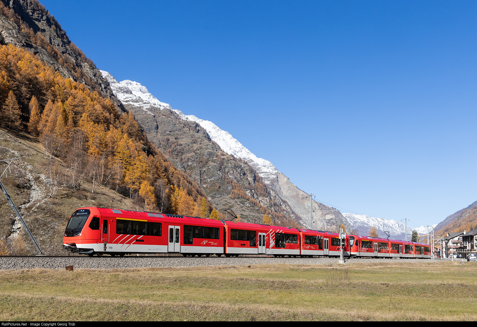 | "Orion" cogwheel trains ABeh 8/12 # 302 and # 307 of the Matterhorn-Gotthard-Bahn (MGB) are running the train 242 of the line RE41 from Zermatt to Visp, before Täsch. |